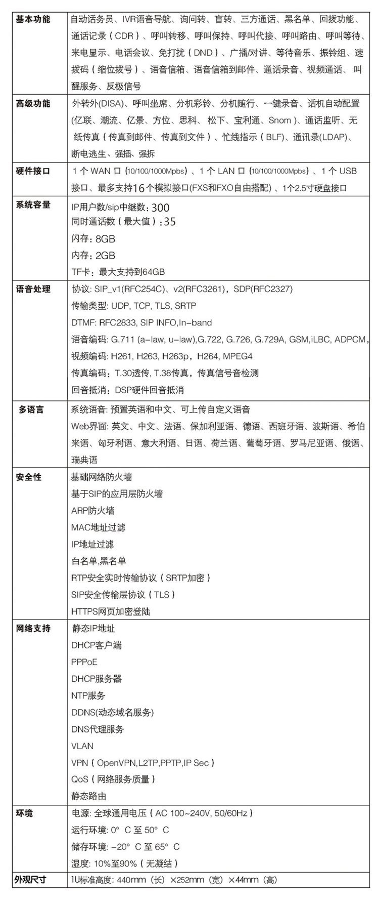 支持自動話務(wù)員、IVR語音導(dǎo)航、詢問轉(zhuǎn)、盲轉(zhuǎn)、三方通話、黑名單、回?fù)芄δ?、通話記錄(CDR)、呼叫轉(zhuǎn)移、呼叫保持、呼叫代接、呼叫路由、呼叫等待、來電顯示、電話會儀、免打擾(DND)廣播/對講、等待音樂、振鈴組、速撥碼(縮位撥號)、語音信箱、語音信箱到郵件、視頻通話、叫醒服務(wù)、反極信號、通話錄音(選配TF卡)等高級通信功能,為用戶 提供穩(wěn)定高效便捷的通話功能。